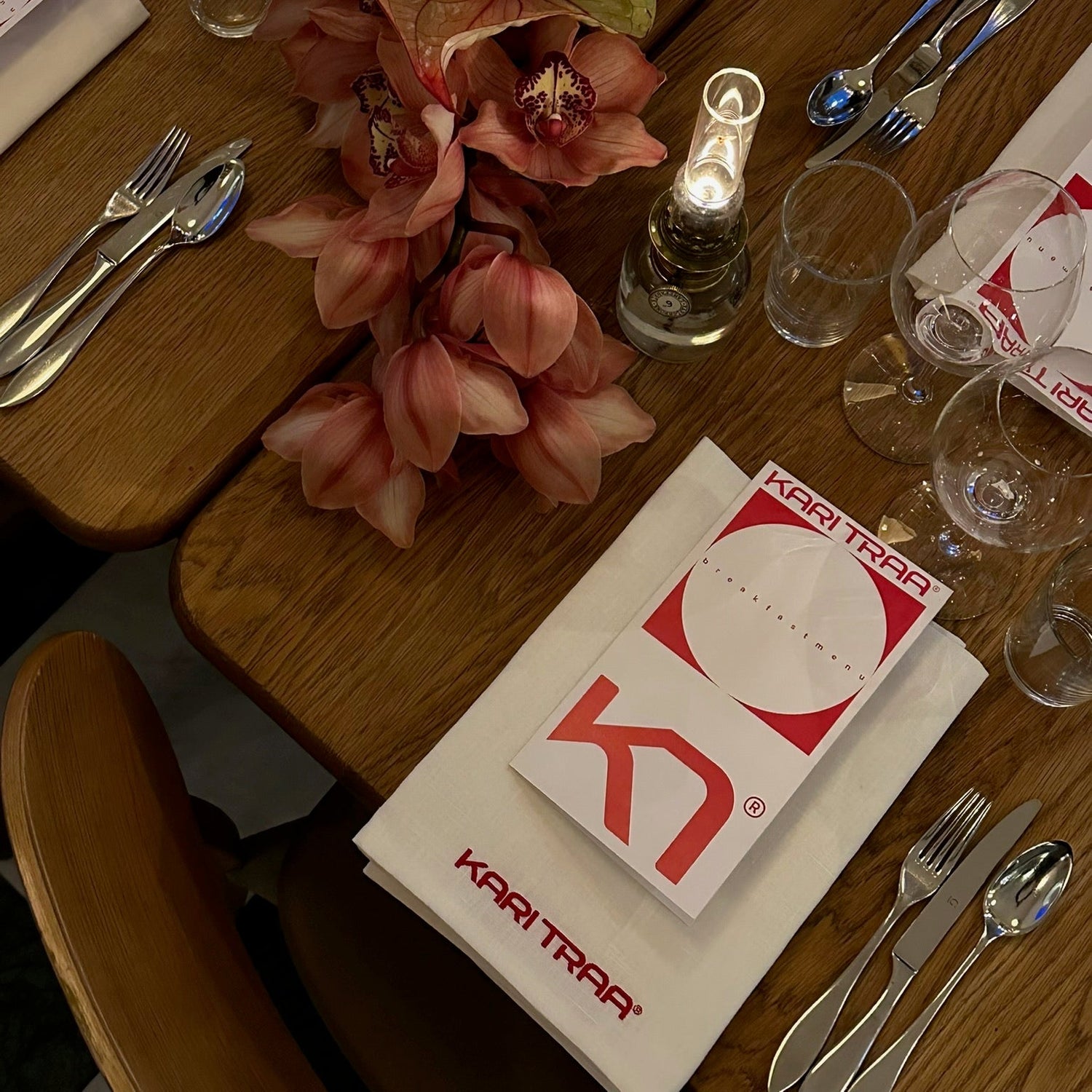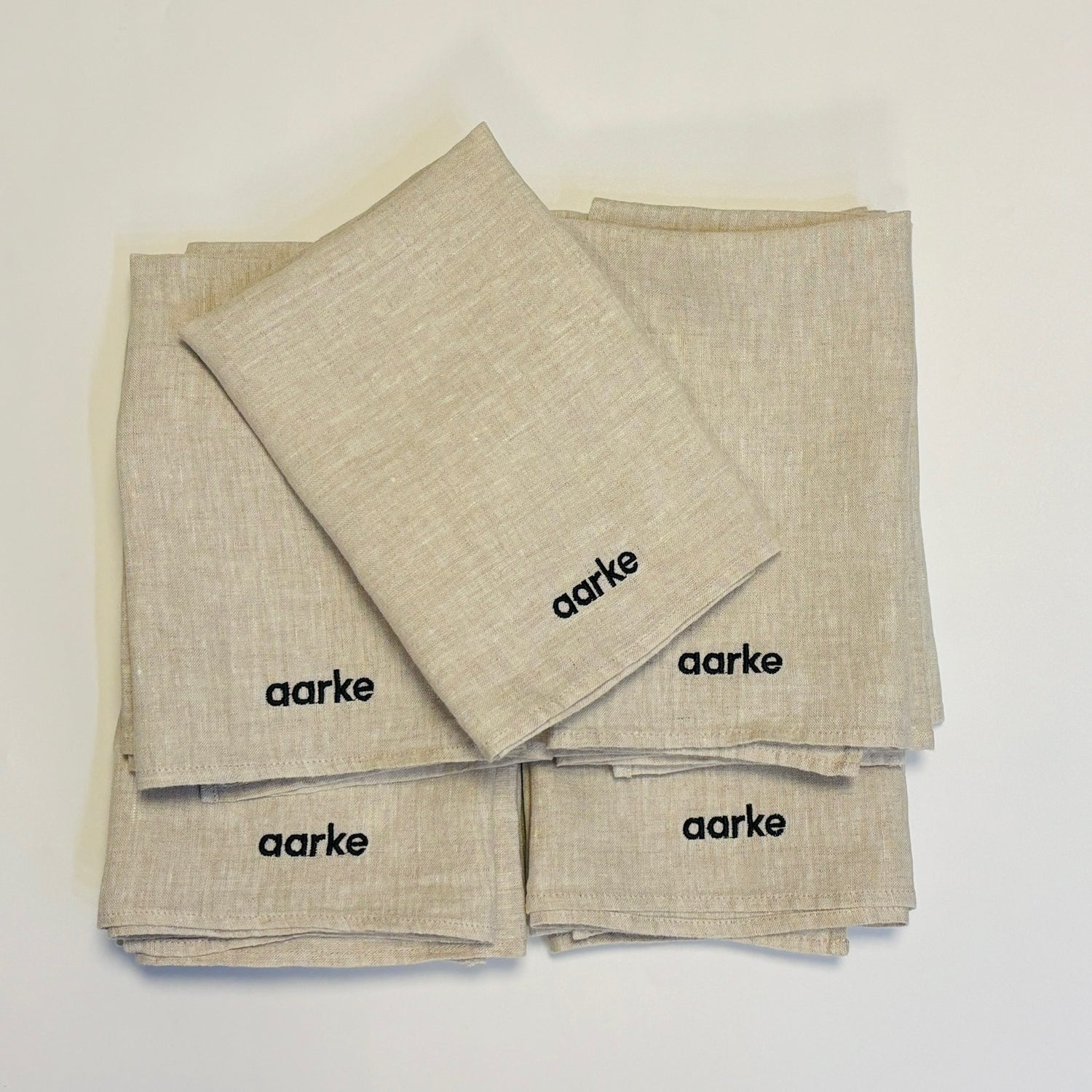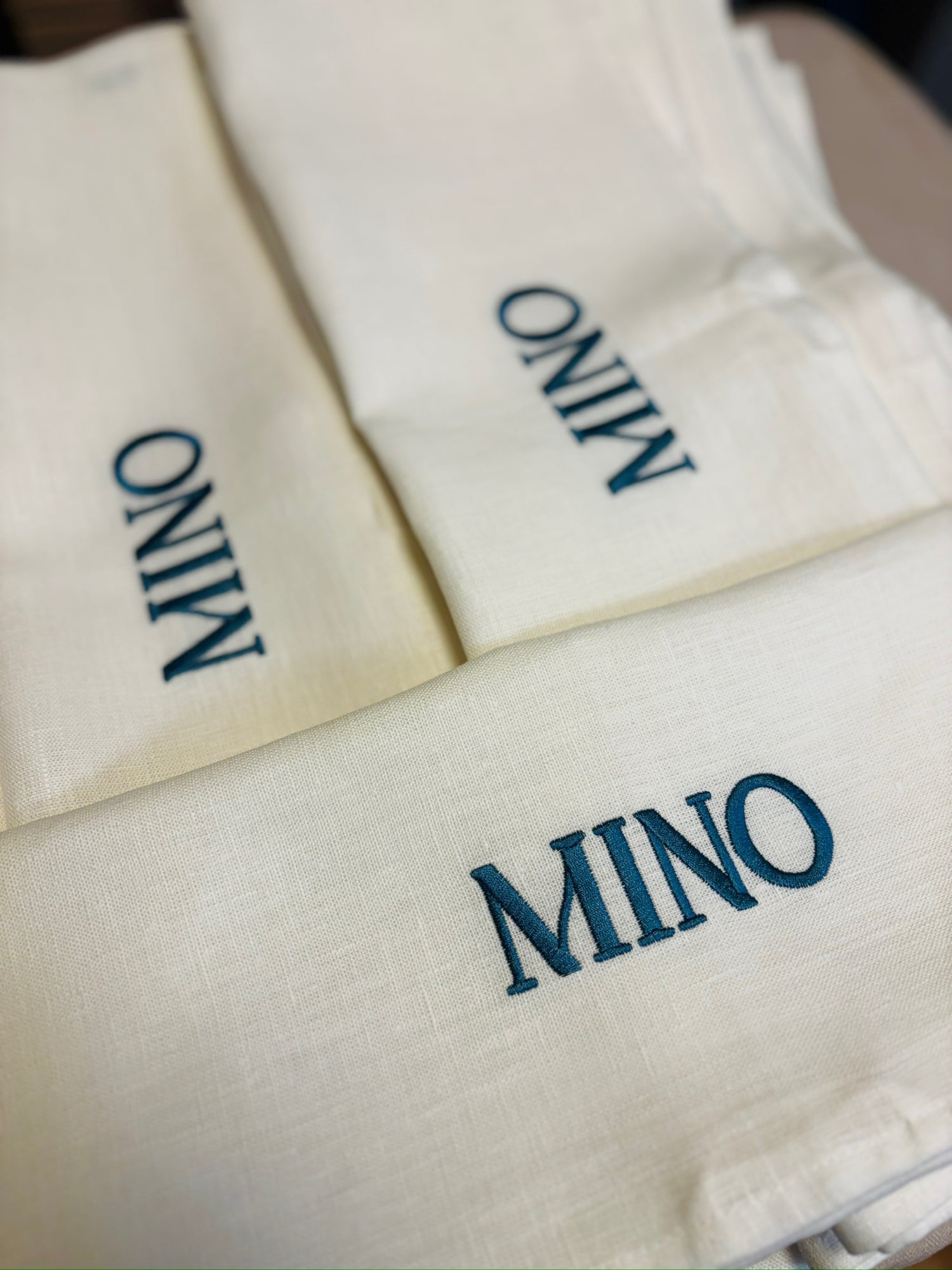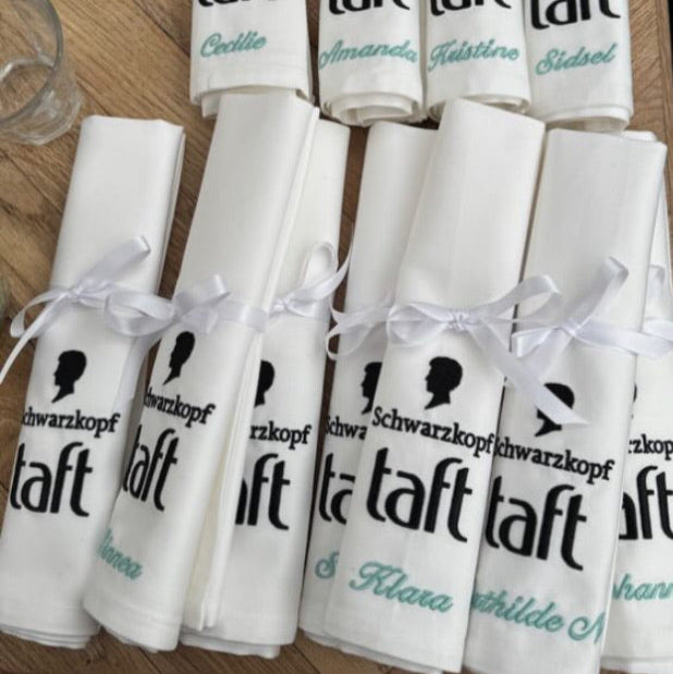 Logotyp, personligt namn och applicerad bård på linneservetter.