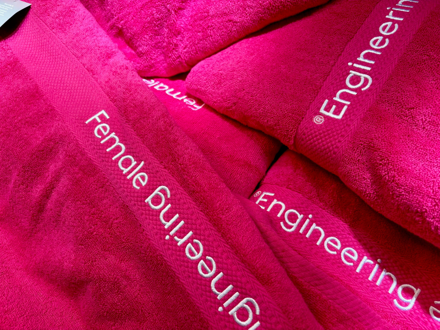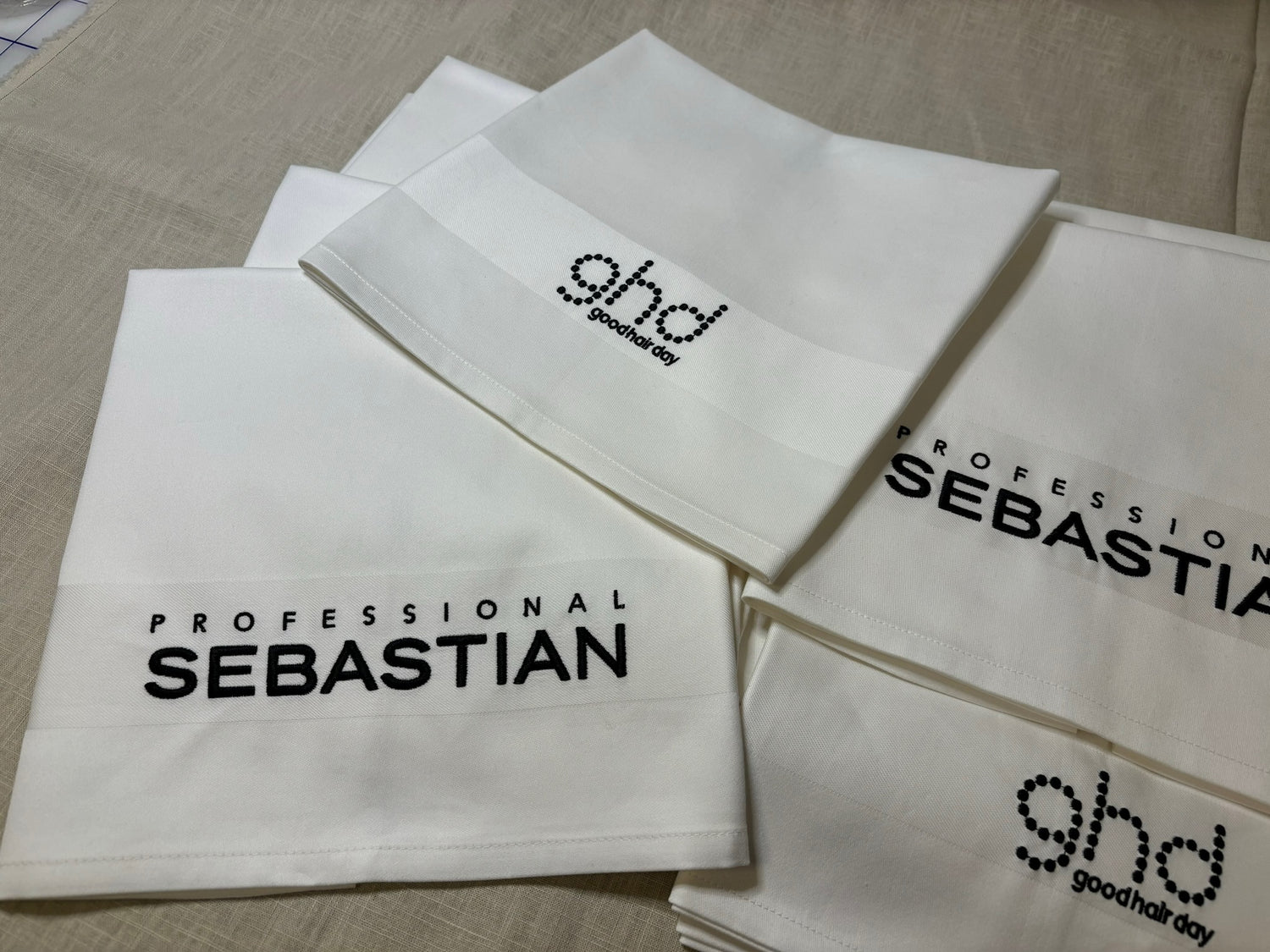 Svart och vit brodyr på förkläden och handdukar till kundens event.