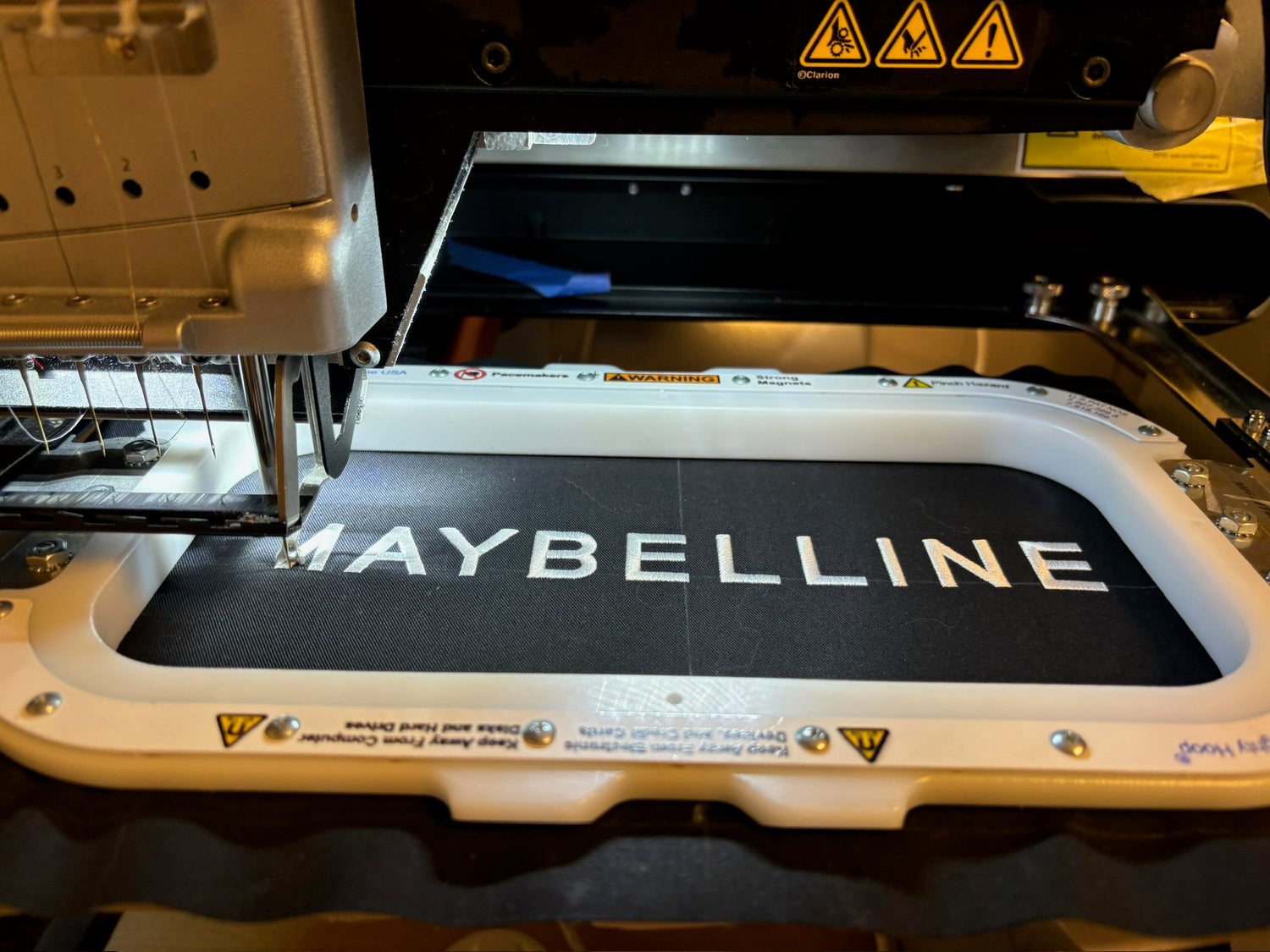 Skarp och tydlig vit brodyr på svart tyg för montering på sminkstol/regissörsstol.