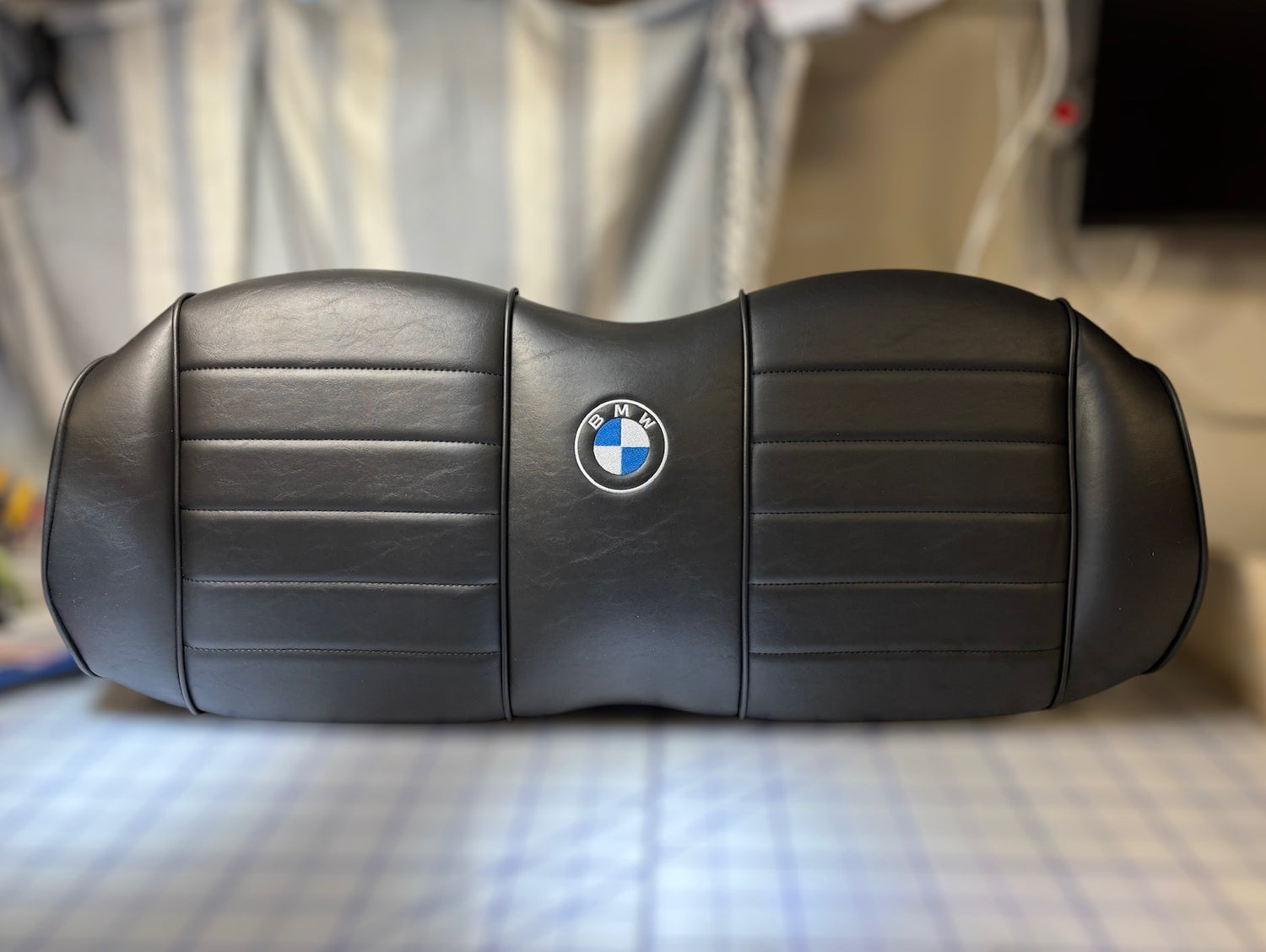 Genom att kombinera min erfarenhet som tapetserare med maskinbrodyr kunde denna klädsel tas av, broderas och monteras på igen. Nu rullar denna fina BMW-golfbil på Bro Hof.